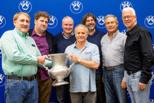 ACBL President Russ Jones presents the Vanderbilt trophy to the Wolfson team.
