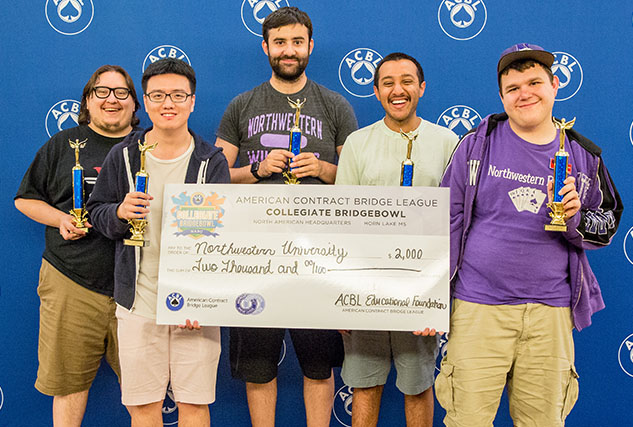 Northwestern: Fourth in the Collegiate Bridge Bowl was Northwestern: Coach Phil McPeek, Liwei Zeng, Daniel Weiss, Sarik Goyal and Kyle Rockoff.The Northwestern team was Liwei Zeng, Kyle Rockoff, Daniel Weiss and Sarik Goyal, and they earned $2000.