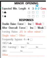 they agree to open 1♣ even with a two-card suit. Pairs who employ this method must check the BLUE box in the “NF 0–2 column” and make an Announcement with their 1♣ opening such as “Could be short.” (“NF” means non-forcing; responder may pass with a weak hand and long clubs.)